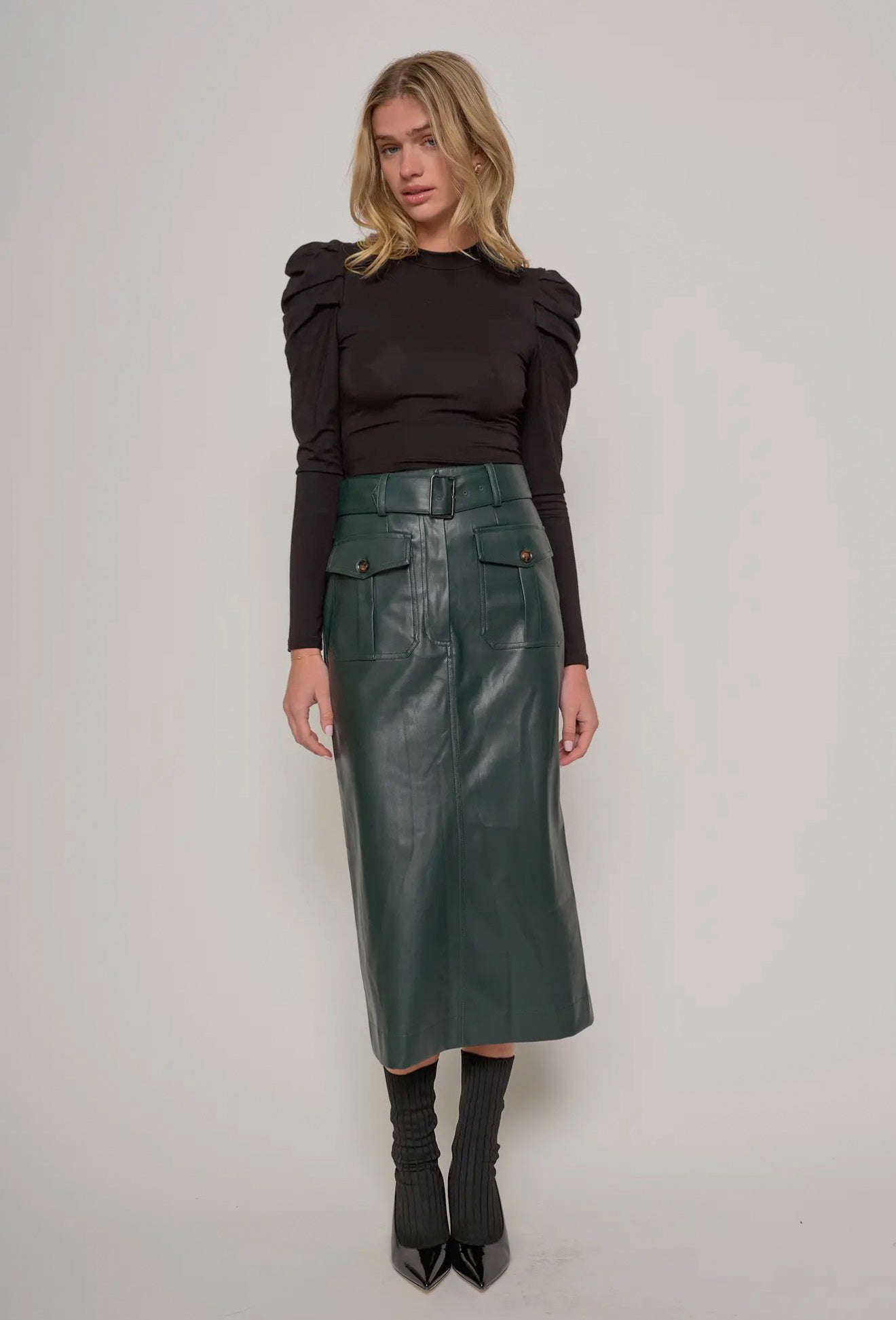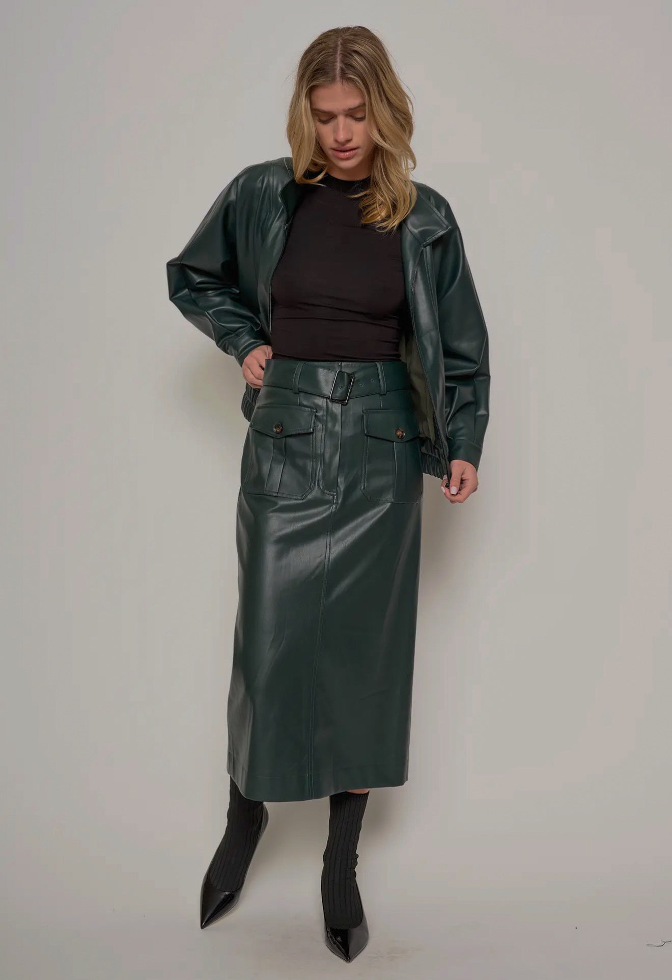 This green leather set, featuring a structured jacket and a sleek midi skirt, is designed for the woman who commands presence with effortless elegance.