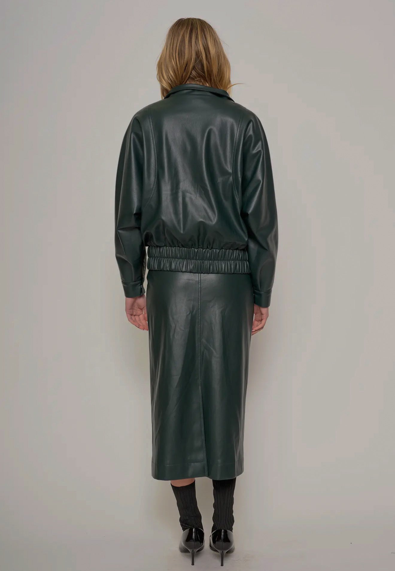 Two-piece set: leather jacket and leather midi skirt
